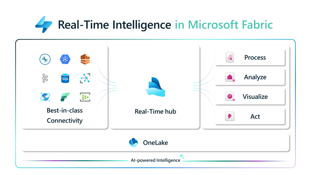 Real-Time Intelligence introduces the concept of the Real-Time hub where users can discover, manage, and connect to their streaming data sources through built-in connectors, regardless of location. The hub also lets you stream data into OneLake for further analysis with the rest of your data estate.
